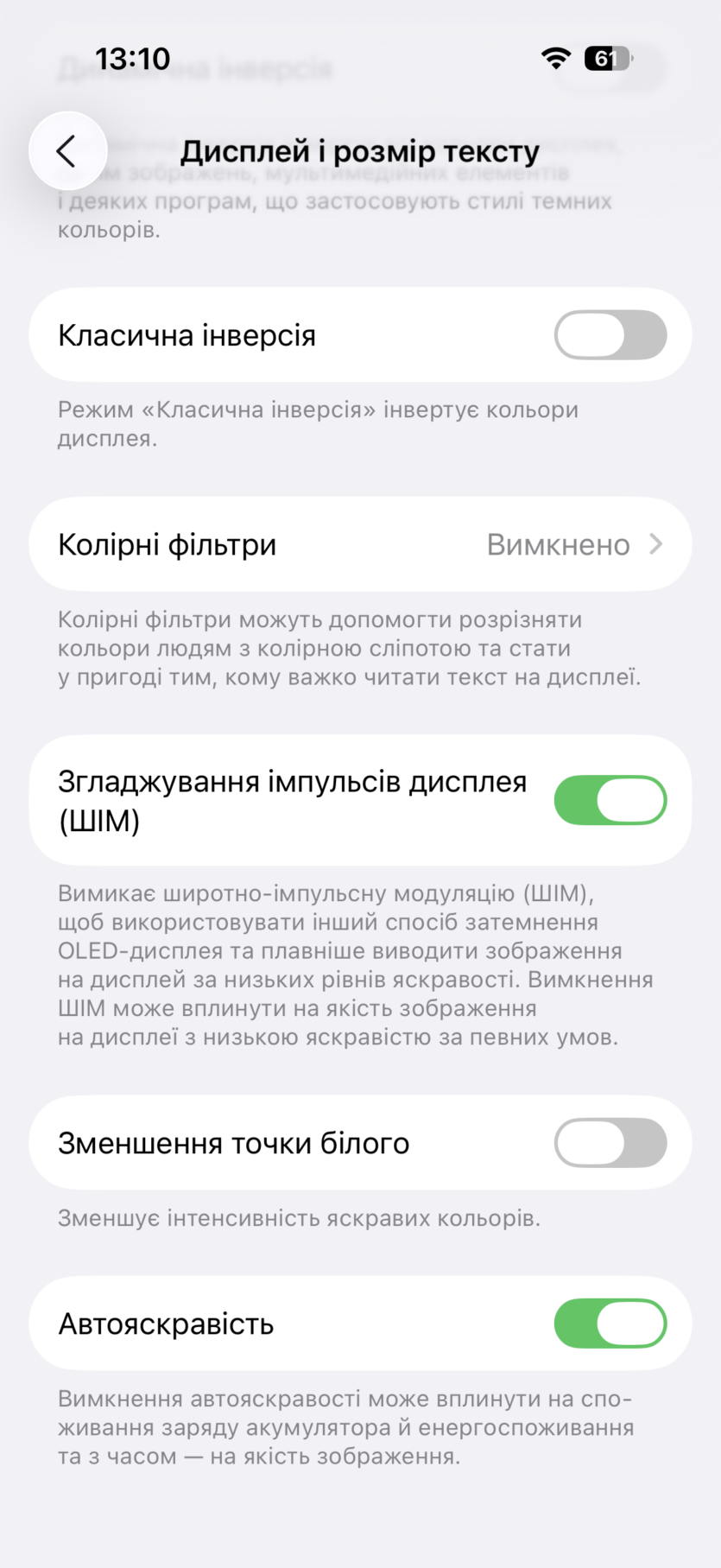 В iPhone 17 Pro есть возможность частично избавиться от мерцания экрана через ШИМ (широтно-импульсную модуляцию), что особенно ощутимо при низком уровне яркости. Функция доступна в настройках в разделе «Доступность» — «Дисплей и размер текста» — «Сглаживание импульсов дисплея».