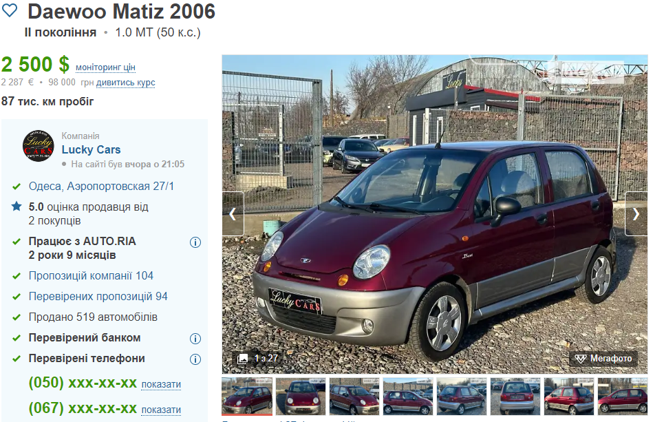 Відкриває добірку Daewoo Matiz. На Одещині дуже багато пропозицій по цій моделі, тому обирати є з чого. Для прикладу ми розглянули автомобіль 2006 року випуску з літровим бензиновим двигуном. Привід: передній. КПП: механічна. Ціна: 2500 доларів.