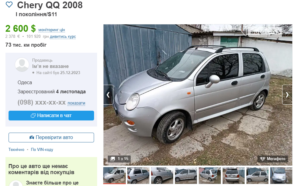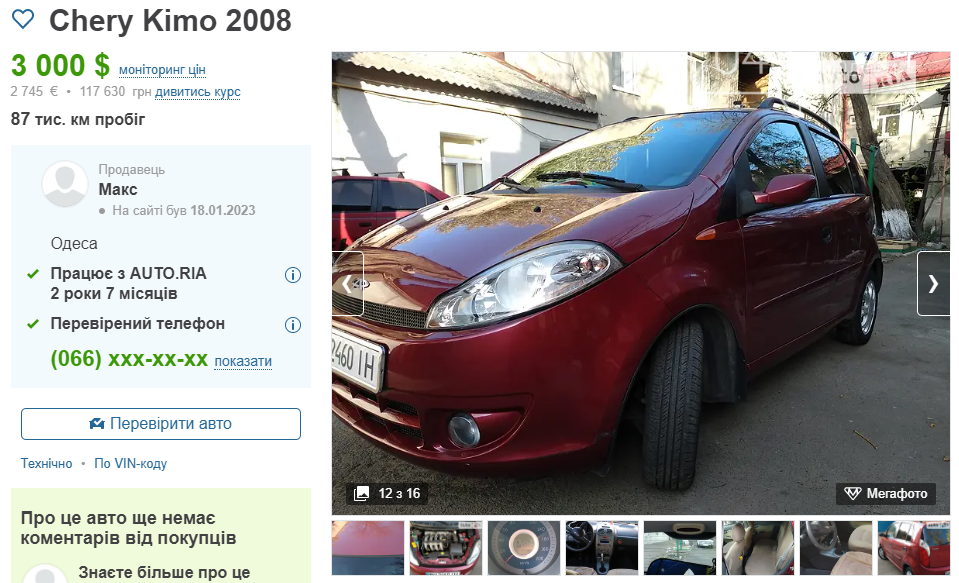 Закриває добірку Chery Kimo 2008 року випуску з 1.3-літровим бензиновим двигуном. Механічна КПП. Привід: передній. Ціна: 3000 доларів. По Одеській області є багато подібних пропозицій.