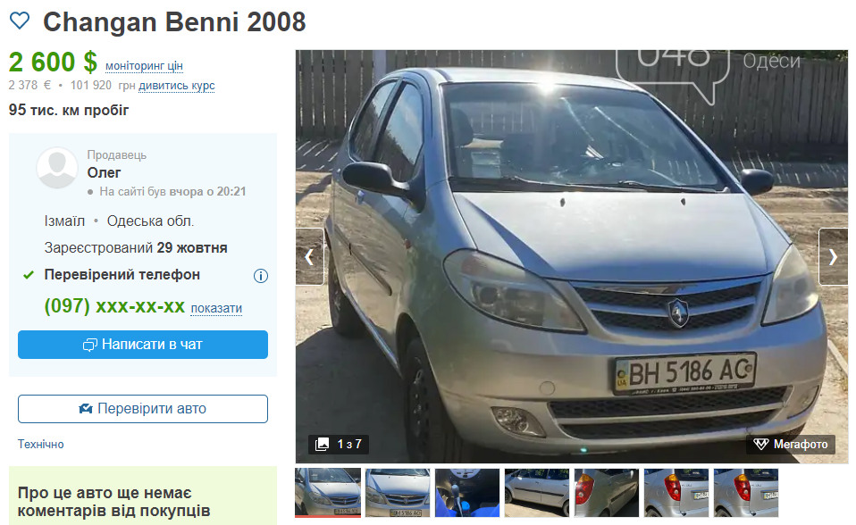 На черзі у нас Changan Benni 2008 року випуску. Це ще один китайський малолітражний автомобіль. Під капотом 1.3-літровий бензиновий двигун. Механічна КПП. Ціна: 2600 доларів. По Одеській області це єдиний варіант.