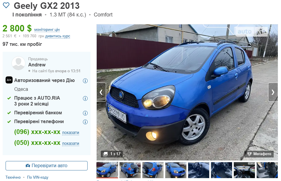 Передостаннє у добірці авто — це Geely GХ2 2013 року випуску. Чергове китайське компактне авто. На відміну від попередніх варіантів цей транспортний засіб позиціюється як кросовер. Під капотом 1.3-літровий бензиновий двигун. Ручна КПП. Передній привід. В нашому бюджеті це єдина пропозиція по Одеській області. Ціна: 2800 доларів.