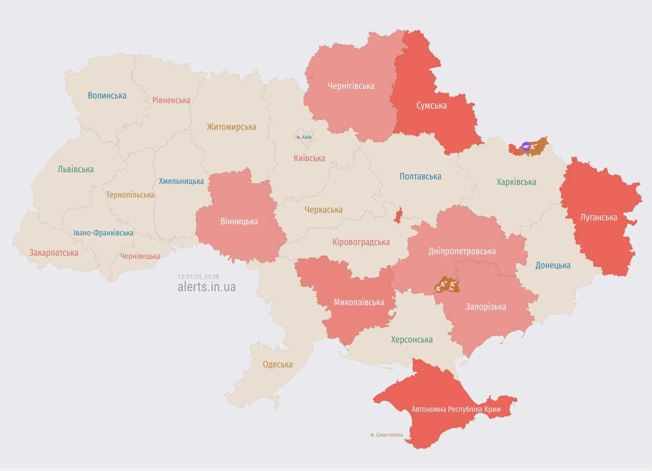 По состоянию на 05:08 карта воздушных тревог Украины выглядела так: