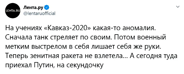 "На учениях "Кавказ – 2020" какая-то аномалия. Сначала танк стреляет по своим. Потом военный метким выстрелом в себя лишает себя же руки. Теперь зенитная ракета не взлетела… А 25 сентября туда приехал Путин, на секундочку", – написали на странице издания Lenta.ru в Twitter.