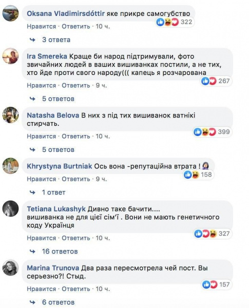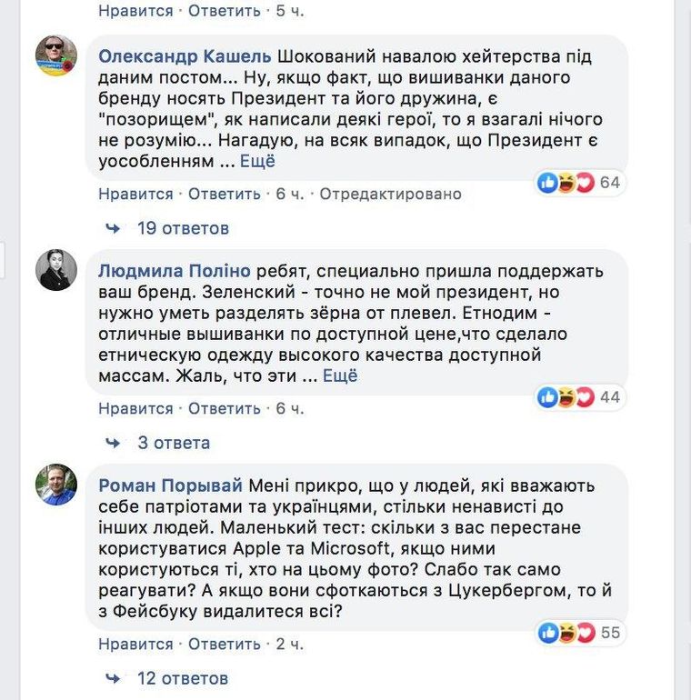 Перелічити всі хейтерські коментарі точно не вдасться, бо їх незліченна кількість. Саме подружжя Зеленських, зокрема, звинуватили в тому, що вони не мають права носити вишиванку, бо не мають "генетичного коду українця". Але основну частину негативу отримав сам бренд.