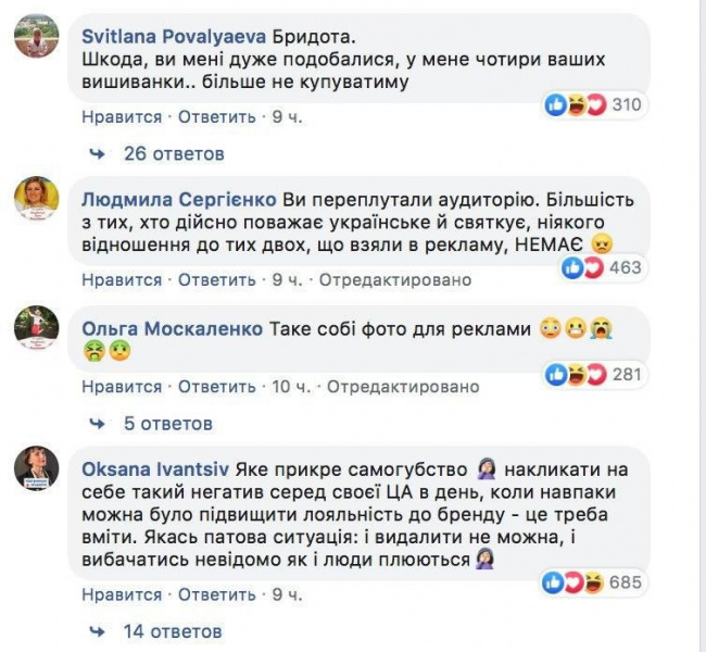 "Бридота. Шкода, ви мені дуже подобалися, у мене чотири ваших вишиванки… більше не купуватиму", – пише Svitlana Povalyaeva.