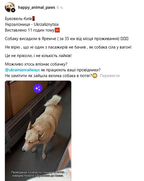 "Буковель-Киев Укрзализныця! Собаку высадили в Яремче (в 35 км от места жительства). Не верю, что ни один из пассажиров не видел, как собака села в вагон! Это не приколы, и не количество лайков! Может кто-то узнает собачку? @ukrainianrailways как работают ваши проводники? Не заметить, как зашла большая собака в поезд", – говорится в публикации.